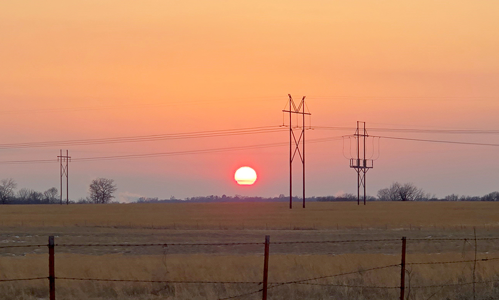 Serene sunset … The rural Oklahoma landscape and a GRDA electric transmission line are bathed in the glow of late winter Oklahoma sunset. While the scene is serene, March is a month when Oklahoma weather can be both a lamb and a lion. This week, GRDA offers some safety tips to keep in mind if March weather acts more like a lion at times.